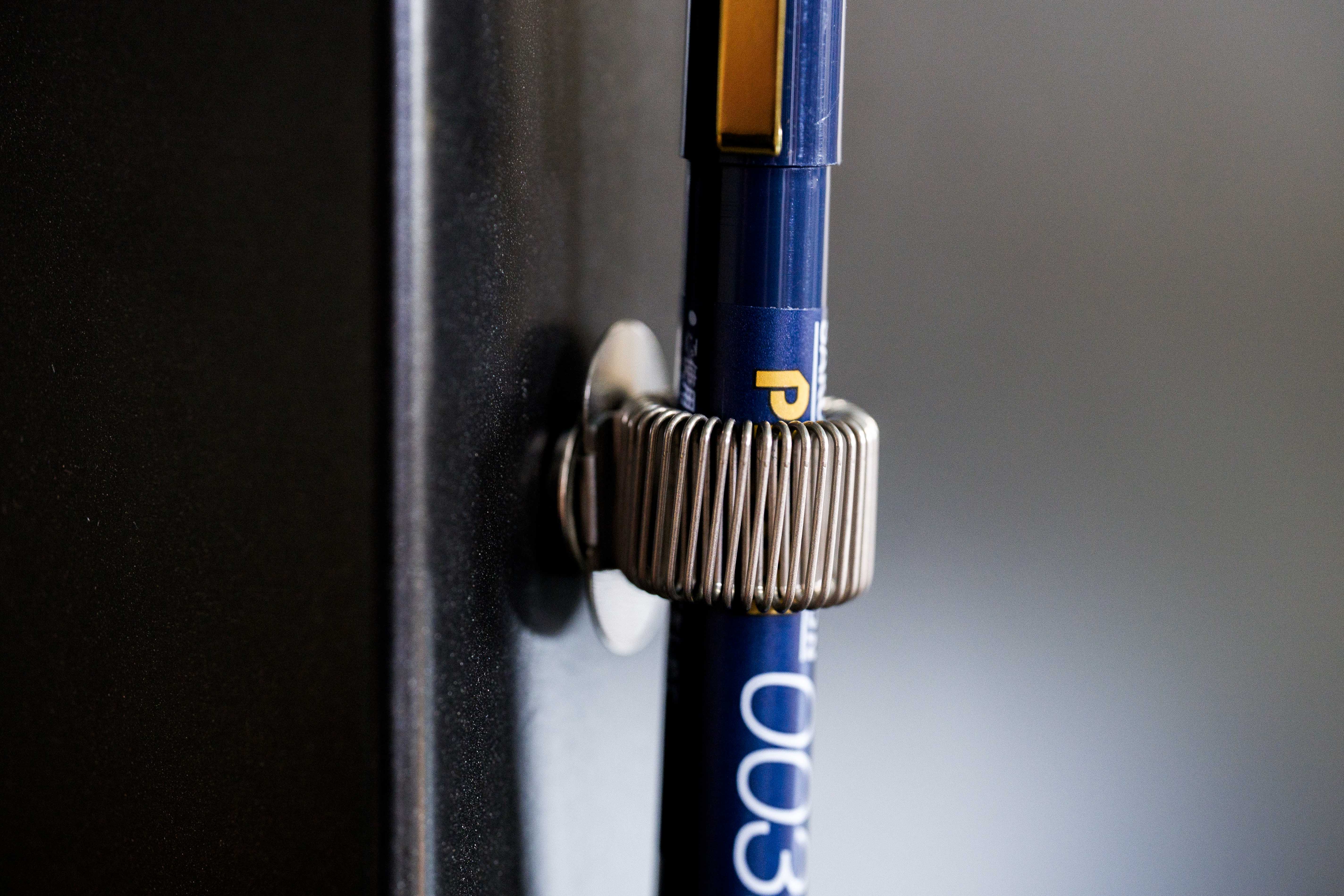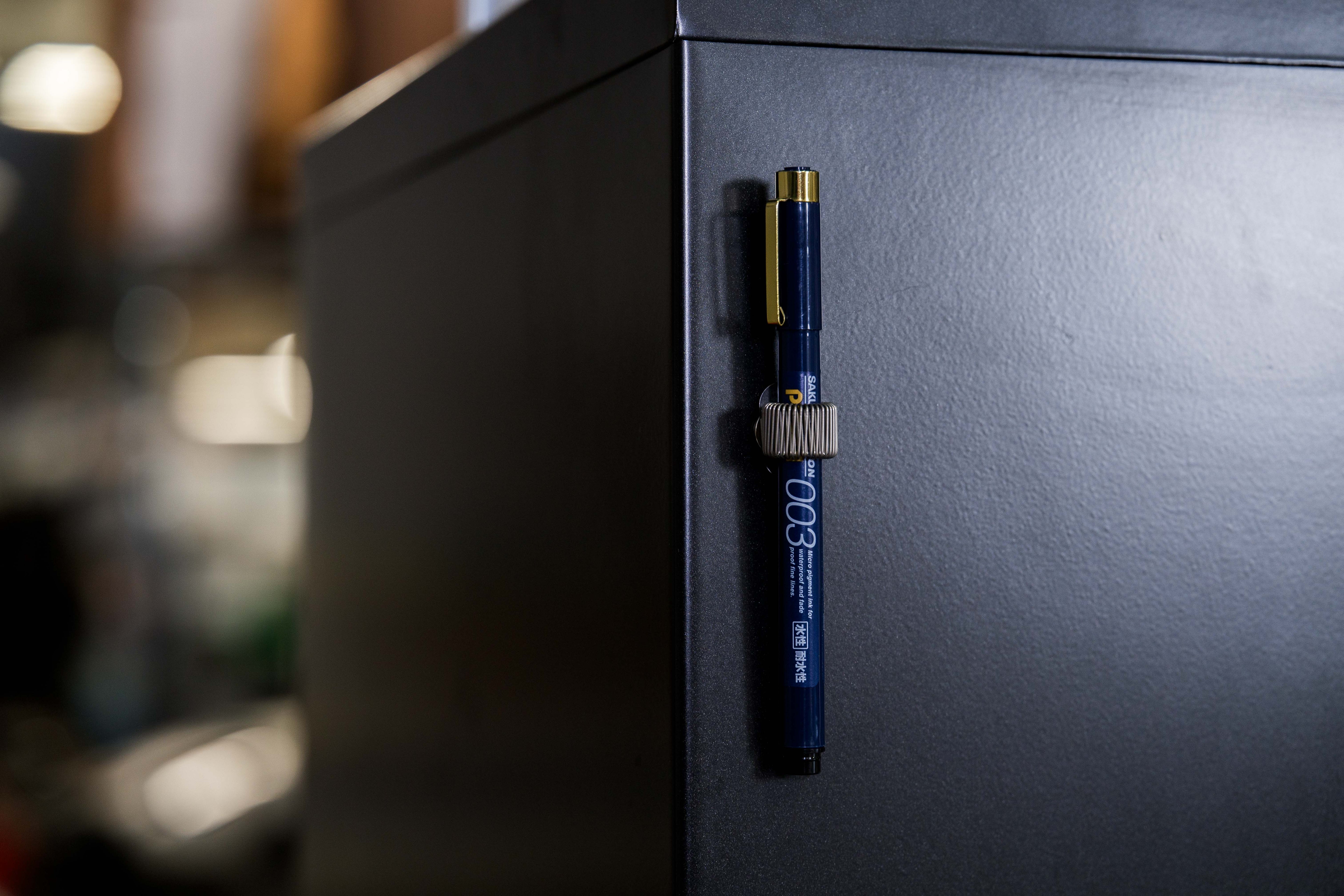 Here's a super useful accessory for offices, schools, and kitchens — a magnetic pen holder that works on fridges, file cabinets, whiteboards, and more. The accordion-style holder can grip any pen of 6 mm or greater diameter. The neodymium magnet holds very firmly to the surface, so it stays attached even when you're inserting or removing the pen.
