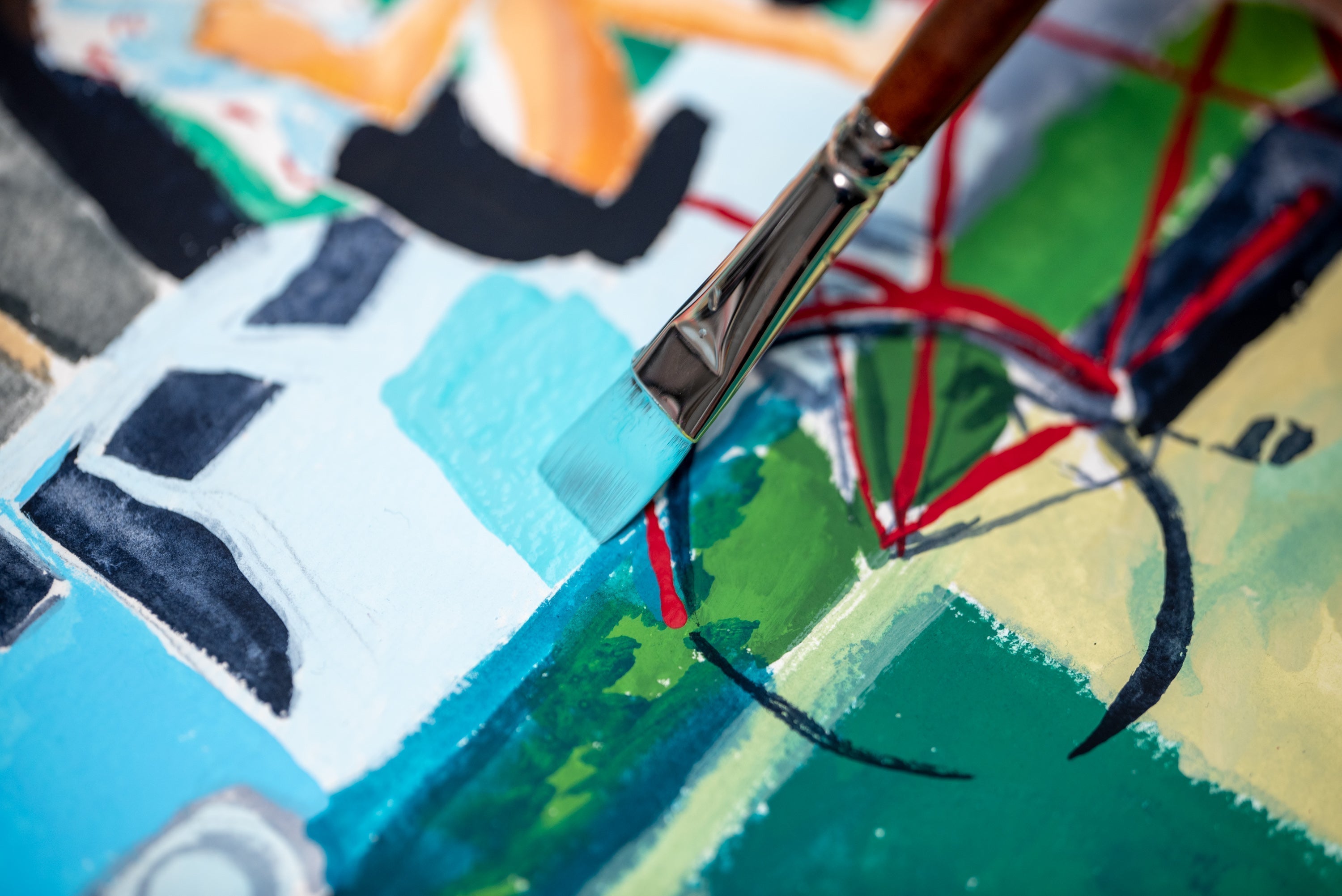 SoFlat Acrylics come in a jar—an unusual format for gouache, and one that immediately signals the differences between this modern medium and its tube-dwelling predecessors. SoFlat is fluid and completely brushable right from the jar, requiring no dilution or modification. For muralists and large-scale painters, SoFlat means freedom from the constellation of cups and pails of diluted colors and a more direct working process.