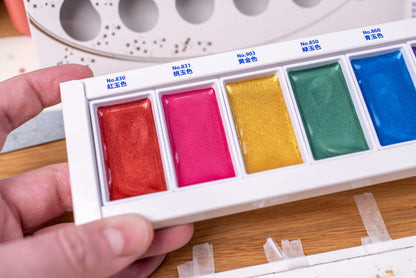 This is the Gansai Tambi Gem Colors set, featuring six sparkly colors from Kuretake's wide range of pearlescent and iridescent colors. The colors included are #830, #831, #903, #850, #860, and #861.