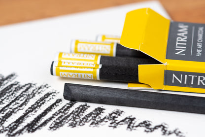 Created in France in 1968, Nitram charcoal is a unique formulation unmatched by any other fine art charcoal in the world. Nitram is neither compressed charcoal nor vine/willow charcoal, but rather something in between, made with a proprietary process that maintains the cellular structure of the wood while also making the charcoal much more consistent, smooth, and dark than willow charcoal.