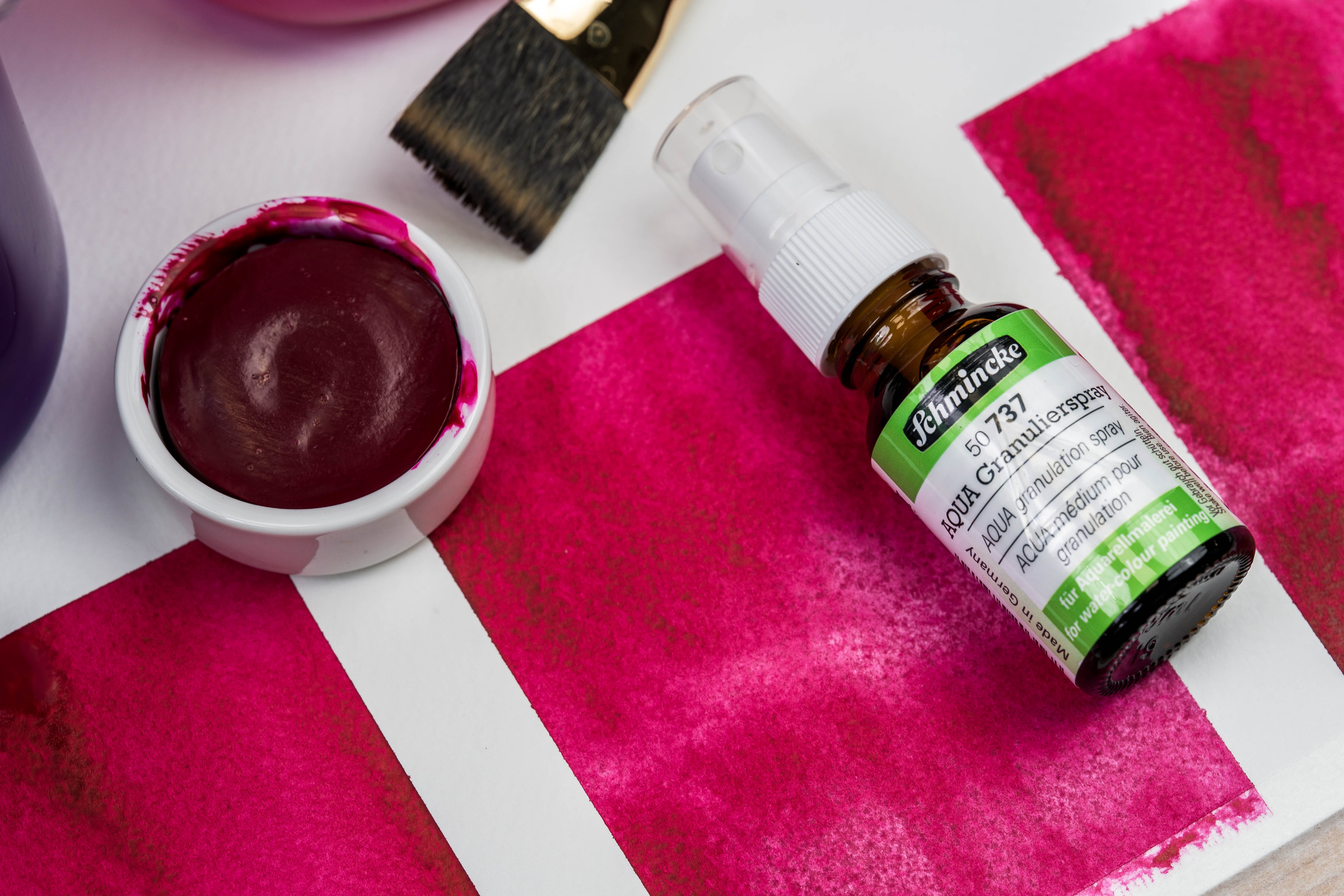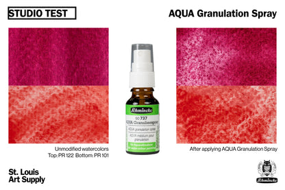 This pocket-sized spray bottle is a quick way to add texture to any watercolor paint. One spritz of AQUA Granulation Spray causes water-based paints to start flocculating — that's the technical term for particles clumping together. The effect is more dramatic on colors that don't usually granulate. These smooth pigments can be made into wildly chaotic surfaces with just a strategic spray or two.