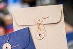 Each envelope is fitted with a button-and-string closure that can be used many times. Inside, the flap is also gummed in case you want to use it for mailing.