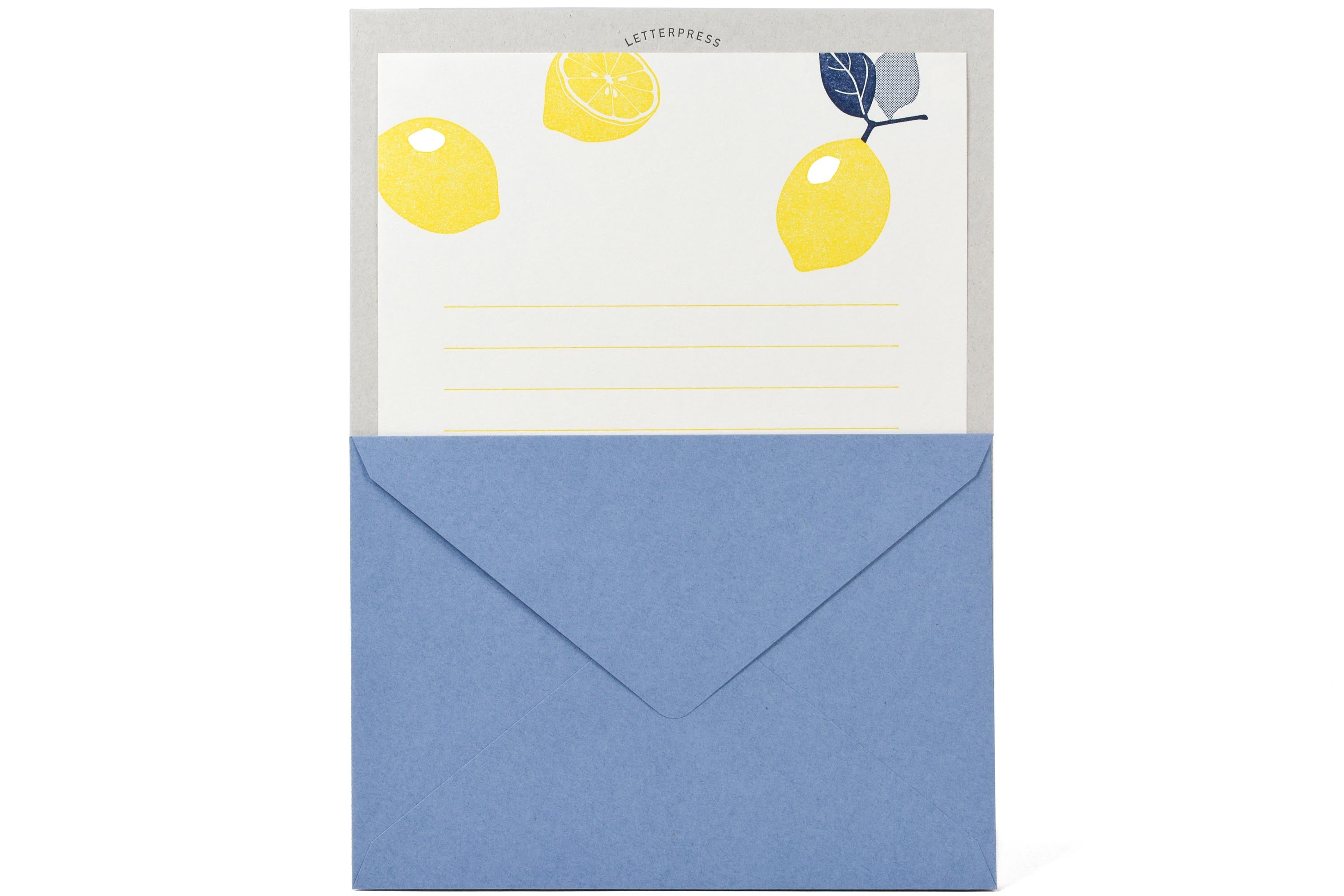 This set includes four dark blue envelopes and eight sheets of lined paper with bright yellow lemons. The paper measures about 6" x 8". We stock Midori letterpress stationery sets in several different colors and designs.