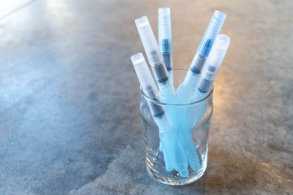 Pentel's Vistage water brushes (you may know them as "Aquash," the alternate name used on packaging intended for the U.S. market) are our secret weapon when working with water-based media like watercolor, ink, and gouache. Unscrew the reservoir and fill it with water. Screw the pen back together and squeeze; water quickly saturates the synthetic brush tip. The water will flow automatically while you paint, keeping the brush wet, and you can squeeze the barrel for extra flow.