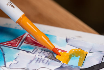 The flexible brush tip is the killer feature of these pens, and it's probably what will get the most use in artists' studios. It's capable of thin or thick lines, and the water-thin ink flows freely for quick fills and saturated strokes. Every color is subtle and well-chosen, and each responds differently when blended with water. You'll notice the little ripples and waves of the various dyes as they separate in dilution. Fountain pen users and urban sketchers, of course, will already be familiar with the unique beauty of a dye ink wash.