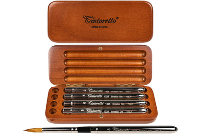 This set contains four round travel brushes made from high-quality synthetic sable. The brush tips are shaped by skilled brushmakers in Tuscany, drawing on decades of experience and the rich tradition of Italian brush manufacturing. You'll find that Tintoretto brushes offer greater control and more predictable performance than mass-produced brushes. This is due to the thoughtful and precise execution of the brush's shape, which can't be duplicated by less labor-intensive techniques.