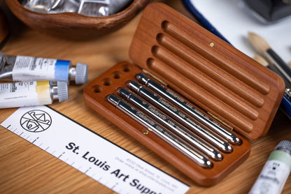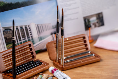 Handmade in Italy and presented in distinguished cherry travel cases, Tintoretto Watercolor Travel Brush Sets are a fine example of craftsmanship, tradition, and attention to detail. Each case is made from solid cherry, polished to a durable semi-gloss finish, and fitted with a magnetic closure. The channels inside are perfectly sized for Tintoretto travel brushes, and four holders are also provided to hold wet brushes vertically.